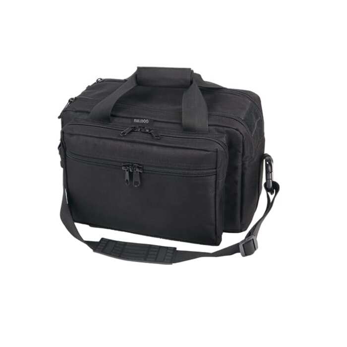 Bulldog Cases XL Deluxe Black Range Bag with Pistol Rug BD905 is a generously sized gun bag for your shooting accessories. Bull Dog Cases builds this range bag from heavy duty Tetron for a water resistant outer shell. The Bulldog Extra Large Range Bag has three hidden pockets for storing gun supplies and shooting supplies. This deluxe package includes a Bulldog Cases pistol rug for extra protection for your handgun. An adjustable shoulder strap with deluxe buckle makes this Bulldog Cases carrying bag easy to carry.
