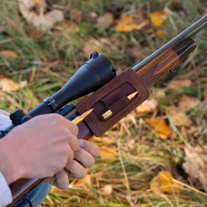 The Castle Rock Forend Ammo Carrier by Allen Company holds two spare cartridges close to the hand for quick and easy access of your ammo. If a quick follow-up shot is needed, the ammunition is ready. The ammo carrier lays in a horizontal position to quickly access and reload your rifle. The two cartridge holders are made of elastic loops, fitting .223 Remington to 300 Winchester Magnum sized ammunition. The cartridge carrier is made of full-grain leather and can fit around most rifle forends. The leather remains highly durable and flexible, lasting season after season.