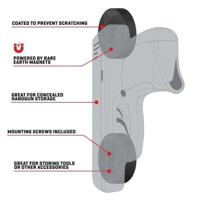 The Allen Company 2-Piece Disc Magnet Set is great for securing anything that is made of ferrous metals. You can use these strong magnets in a wide variety of challenging applications where extreme strength and dependability are critical. The rare earth disc magnets are much stronger than your ordinary magnet, made as an ideal fastener to hold handguns, tools or parts. The two magnetic pieces are coated to prevent scratching and can be used separately in your project space with proper spacing. Each magnetic disc is made with a pre-drilled hole to easily be drilled onto the wall or any other surface in your project space—mounting screws are provided for complete assembly.