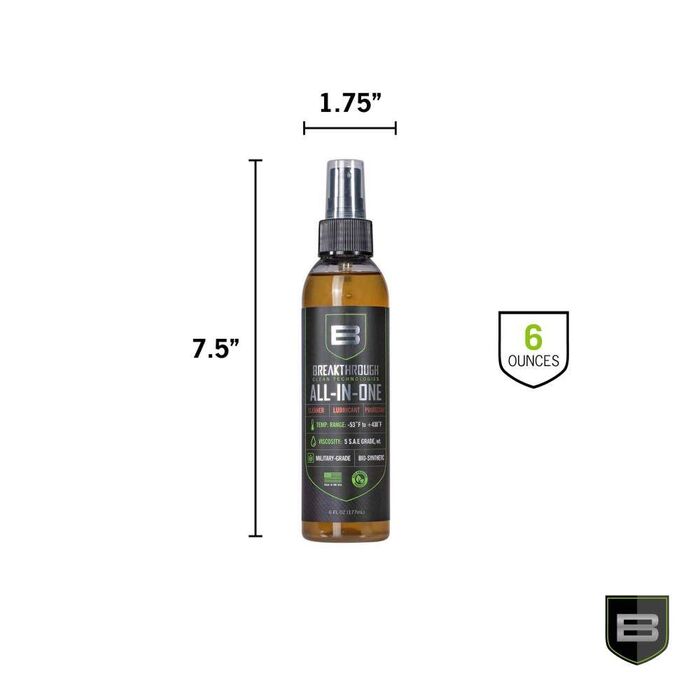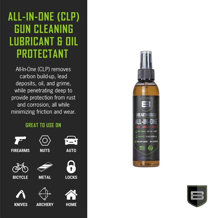 This Breakthrough Clean Technologies® Bio-Synthetic All-In-One (CLP) is expertly crafted using the finest base oils, additives, and most effective solvents that modern chemistry has to offer. Providing superior two-in-on cleaning and lubrication, the All-In-One (CLP) removes carbon build-up, lead deposits, oil, and grime, while penetrating deep to provide protection from rust and corrosion, all the while minimizing friction and wear from metal-to-metal contact. The All-In-One (CLP) is a great addition to your range bag to keep your firearms running smoothly. Shake well before use.