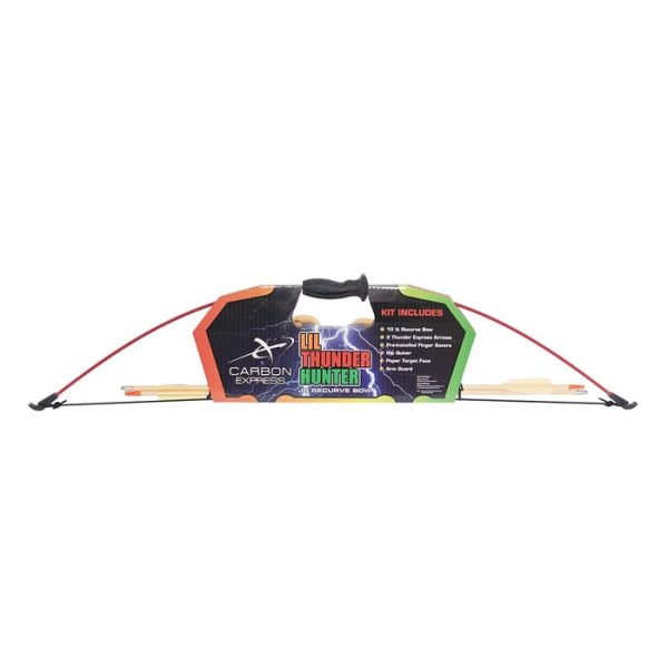 The Lil’ Thunder Hunter Is A Great Youth Bow Package That Will Provide Hours Of Fun. The 10Lb Recurve Bow Is Great For Younger Archers Just Getting Started. The Pre-Installed Finger Savers Allow For Hours Of Shooting Without Finger Fatigue, And The Arm Guard Keeps Their Forearm Safe While Learning Proper Form. The Hip Quiver Attaches Easily To A Belt Or Belt Loops To Keep Arrows Safe And Organized Both While Shooting And When Being Stored. The Paper Target Face Easily Pins To Foam Archery Targets And Will Light Up Their Face When They Get A Bullseye For The First Time!