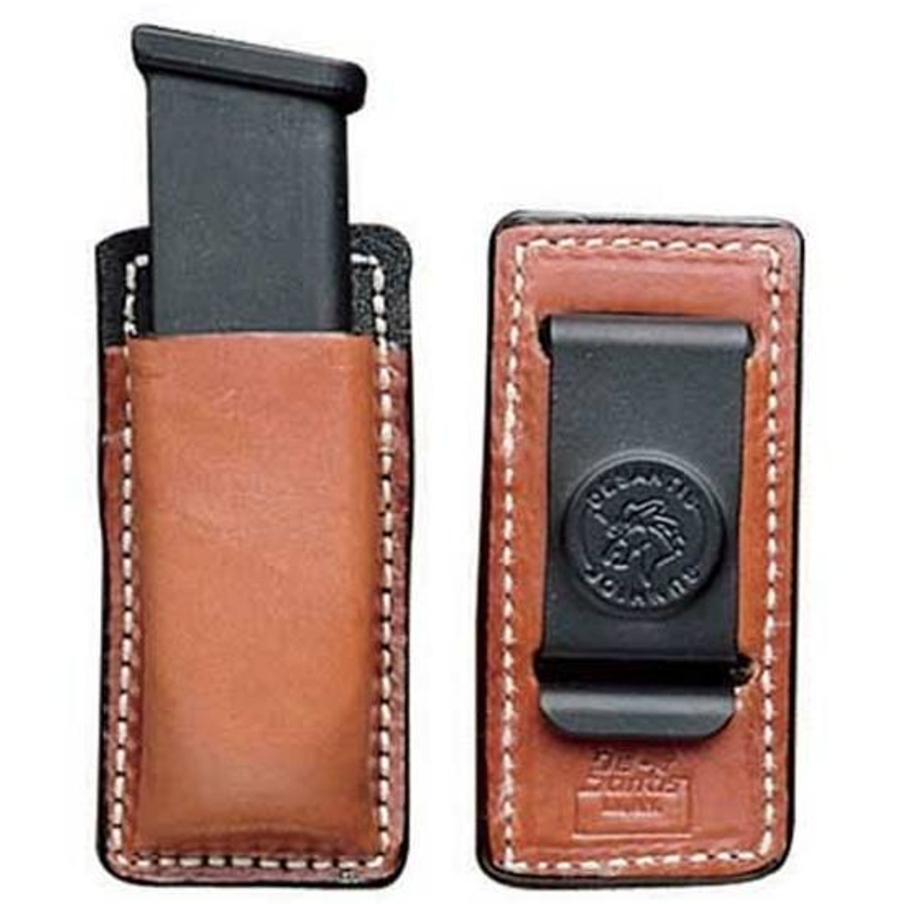 The A47 is a single magazine pouch with belt clip. It has a unique magazine-tension device inside for added security. Available in black or tan unlined leather. Accommodates belts up to 1 3/4″ wide