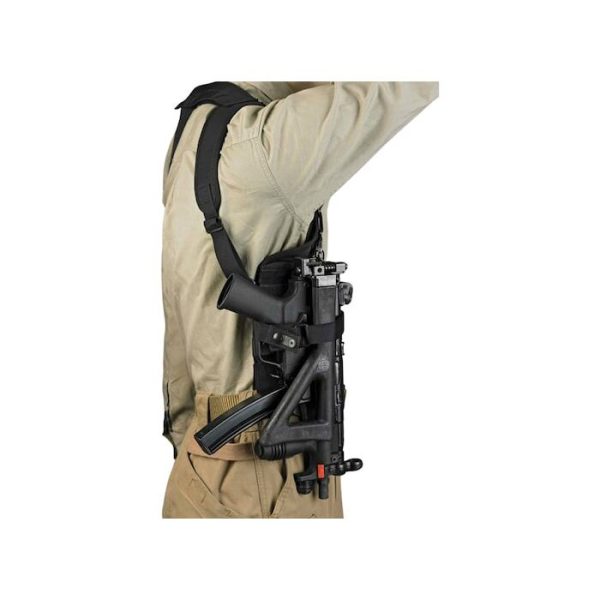 Designed for domestic and foreign operations where maximum firepower needs to be discreetly carried;the DeSantis Gunhide DSD Rig Shoulder Holster is the answer. This rig allows the user to carry a SMG as well as an additional 2 full-sized magazines all the while presenting no visible weapons. Both hands of the security agent are free to open doors;manipulate crowds and direct the assigned principal’s direction. The rig features a “quick-detach” system that allows for rapid disengagement of the weapon from the rig if an extended incident engagement occurs. The rig is easily concealed under a wind breaker or mid-length jacket. The DSD rig is mainly made from heavy duty Mil-Spec nylon webbing and is built to be comfortable and durable. It will work with most sub-machine guns and is equipped with a magazine pouch for either 9mm or .223.