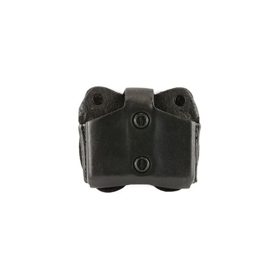 This double magazine pouch features a snap-to-the-belt design. May be carried horizontal or vertical. Available in black or tan unlined leather. Accommodates belts up to 1-3/4 inches wide. Fully adjustable dual tension device. Please note: pouch for small caliber guns may not only fit belts up to 1-1/2 inches and may only have the vertical belt slots.