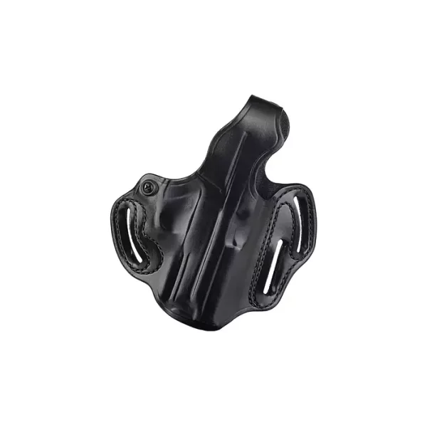 The DeSantis Gunhide Thumb Break Mini Slide is constructed from premium saddle leather with double seams and a highly detailed molded fit;make this exposed muzzle;tight fitting;two-slot holster a great choice for your favorite pistol. It features an adjustable-tension device. Available in black or tan leather. Belt slots are 1 3/4″ wide.