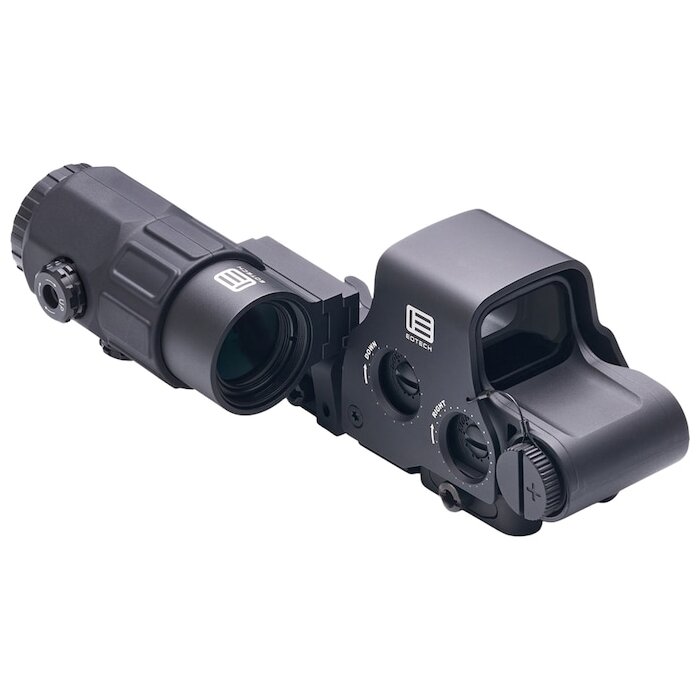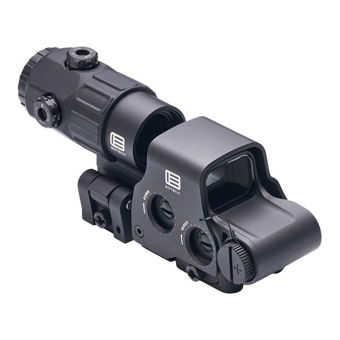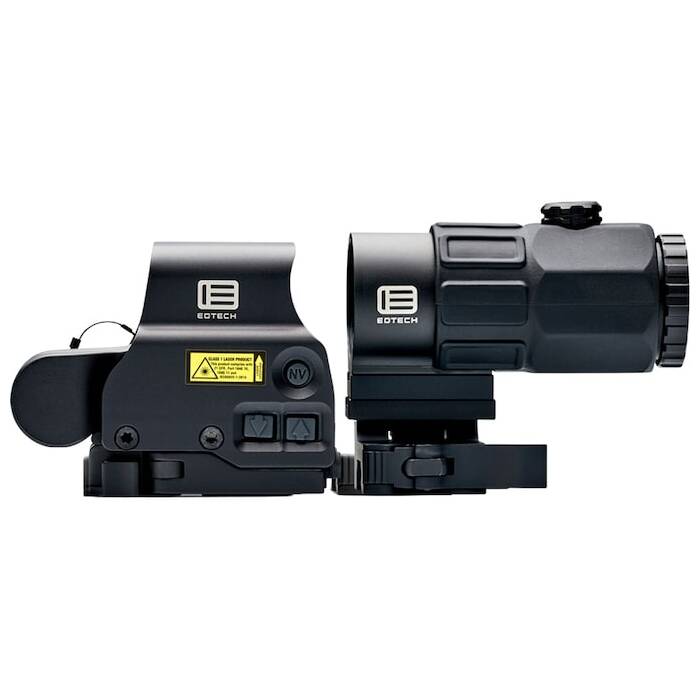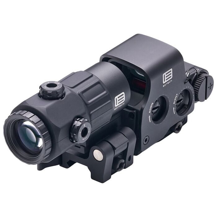 The EOTech HHS V features an EXPS3-4 with a G45 magnifier combination creates the perfect solution for close-quarter combat situations as well as 600 yard targets. Instant transition is achieved through a switch-to-side mount that offers a simple and quick disengagement of the magnifier. The HHS V is a durable night vision-compatible system that offers wide field optical performance for visibility in extreme low-light conditions.
