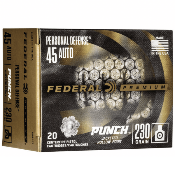 Federal 45 Auto 230 Gr JHP from Federal’s Personal Defense PUNCH line, offers shooters a protection round they can rely on. With a skived jacket and soft lead core, this 45 Auto round at Powder Valley provides the ideal expansion and penetration one needs to deliver a knockout blow.