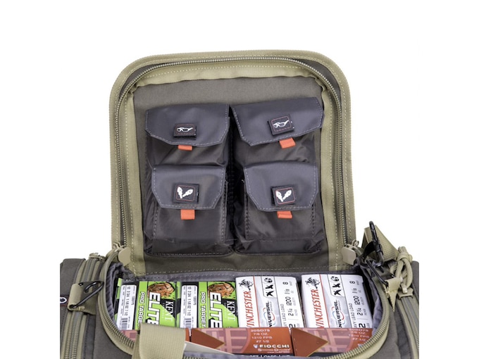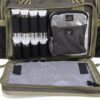 Visual I.D. Storage System helps the shooter quickly access shooting glasses, ear plugs, ear muffs, binoculars, shooting targets, tools, ammo dump cups (2), stapler, tape or cleaning supplies. Lift ports are on each end of the bag for easy maneuvering with 2 hands. Padded walls and bottom for protection. Metal hardware on the shoulder strap. Large loop zipper pulls allow for a lock. Can store up to six handguns and ammo. Dimensions: 14x11x9 inches.