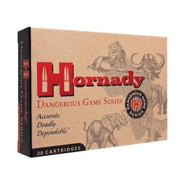 From African big game to the American Grizzly Bear, Hornady’s Dangerous Game ammunition provides the shooter an exceptional load with more energy transfer and lots of knockdown power. The DGS non-expanding bullet is recommended for thick-skinned game such as elephant, rhino and hippo. Its tough copper clad steel jacket is designed to provide maximum penetration from all angles on thick-skinned and heavy boned dangerous game animals. Powders are carefully matched to each load to ensure optimum pressure and velocity, and to regulate in double rifles. Like all Hornady ammunition, Dangerous Game ammunition uses the highest quality cases and primers available. Consistent components translate to consistent shooting in the field. This ammunition is new production, non-corrosive, in boxer-primed, reloadable brass cases.