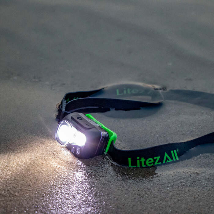 The LitezAll Rechargeable Nearly Invincibleâ„¢ Head Lamp is feature packed, incredibly durable and waterproof. The headlamp features 8 light modes including the ability to combine functions for even more flexibility. When attached to the included head strap, the light may be tilted down up to 45 degrees in 3 locking positions.