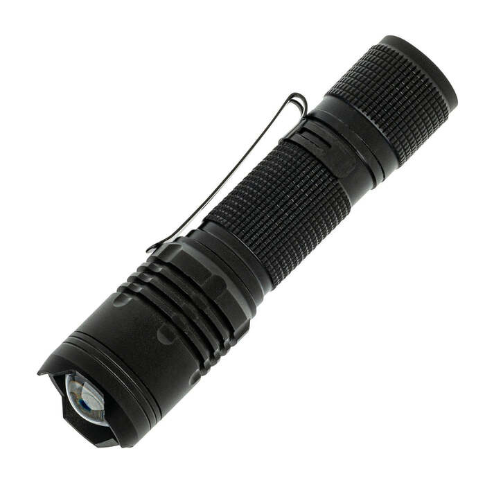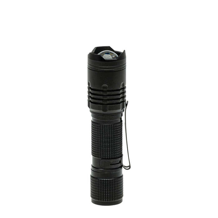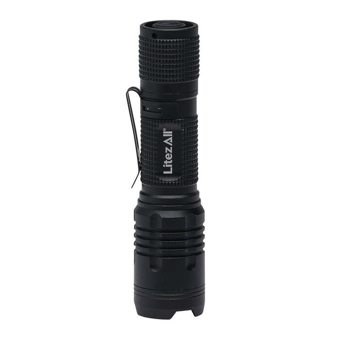 The LitezAll LA-300FL provides up to 400 max lumens of light. The flashlight has 2 brightness modes and features a focusing beam plus a sturdy metal pocket clip. Built tough for demanding situations.