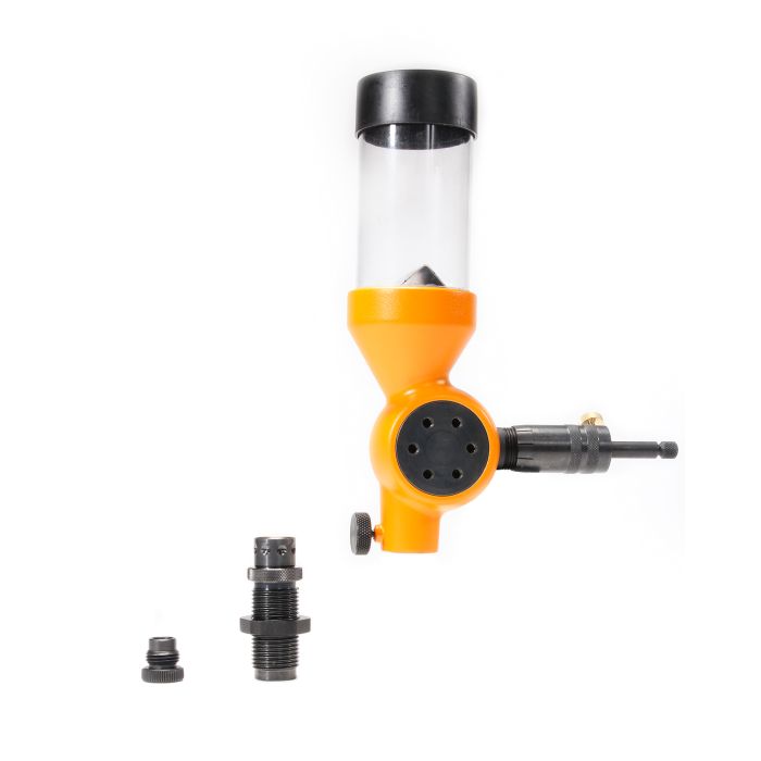 Whether dropping charges for small pistol cases or large rifle cases, this measure gives consistent and accurate performance. The CNC machined steel metering cylinder features a micrometer adjustable thimble with reference lines so resetting the measure is easy. The reservoir is equipped with a powder baffle which maintains a consistent powder level for top accuracy. Includes two drop tubes to cover the full range of calibers.