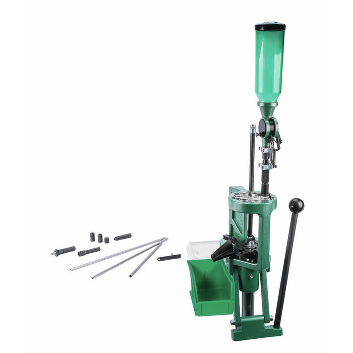 RCBS® Pro Chucker 7 Auto Index Progressive Press. The first seven-station auto-indexing press on the market, The Pro Chucker 7 features automatic indexing for maximum production, with a load rate of approximately 600 rounds per hour. The quick-change die plate allows fast caliber change over for even greater efficiency. Standard primer pick up tubes are used with the safety-shielded priming system. Spent primers are efficiently dropped from the bottom of the press to be captured in a trash receptacle. The large powder capacity Quick Change powder measure reduces the number of times you have to fill the powder hopper. Plus, the Quick Change drain tube allows you to drain the powder measure without removing it from the press. QC metering assemblies allow shortened set up times when switching powders. Seven stations allows you to progressive load any way you want: Seat bullets and crimp separately. Use a bullet feeder but also use a Lock-Out or Powder Checker die.