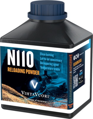 N110 rifle powder is VihtaVuori’s fastest burning powder making it a versatile choice for pistol and rifle reloading. This powder is very popular when reloading for hunting and varminting. The ignition offers top performance with small rifle primers, and N110 is a great choice for small rifle cases, Magnum pistol and revolver cartridges.