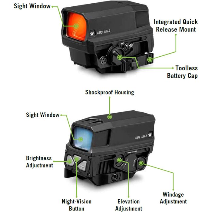 When you rely on a tactical optic to keep you in the game, you’ve got to be ready to shine, day or night. The AMG UH-1 Gen II is the close-quarters solution you’ve been asking for, offering an incredibly fast holographic display to conquer every close-quarters situation, now with four night-vision compatible settings and a dedicated night-vision button. A large viewing window makes this door-kicker even faster, and a sleek, snag-free build looks and maneuvers great. The lightning-quick EBR-CQB reticle is designed to dominate in close, and our FHQ technology virtually eliminates stray light emissions for stealth shooting. Duty never sleeps, and the AMG UH-1 Gen II is ready to light your way.