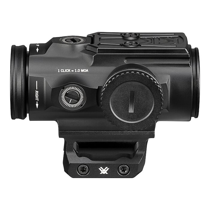 The Spitfire HD Gen II 5x prism scope offers 12 brightness settings with ultra-low settings for night vision use. It comes with a mountable MRDS platform for Vortex red dot sights